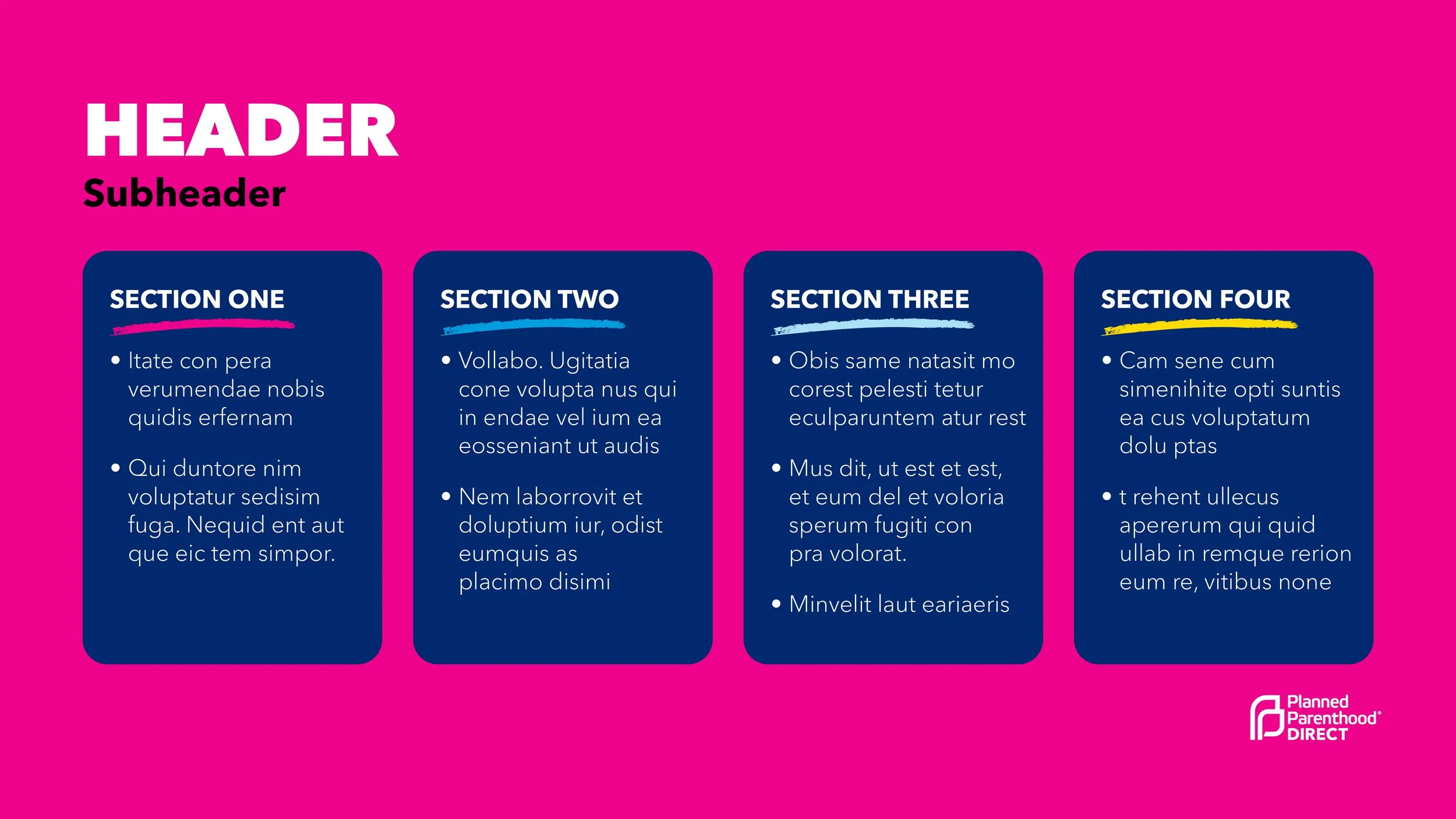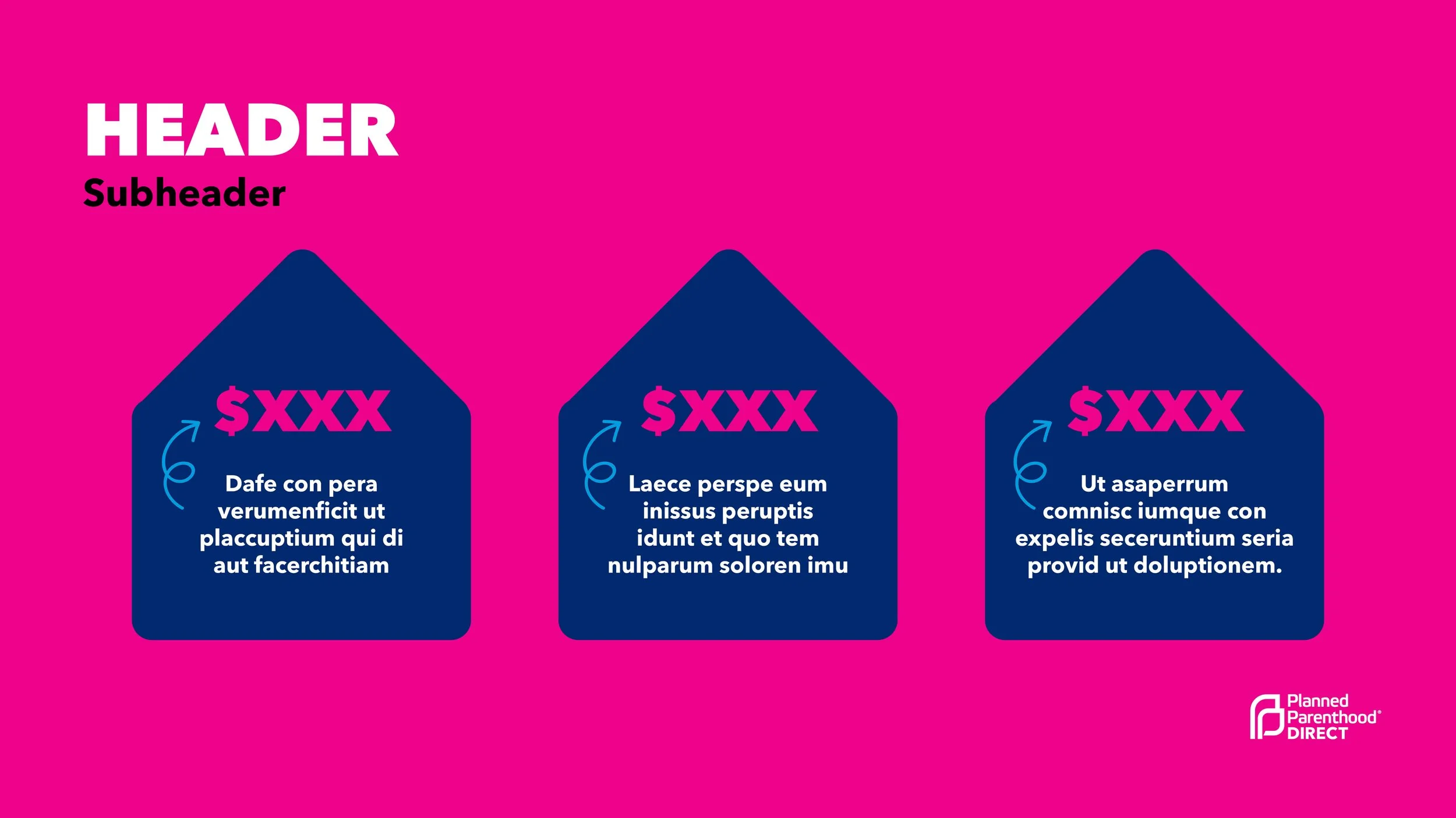 Client wanted eye catching ways to present their research and findings. Using bold brand colors and fonts and adding in icons and arrows made for a powerful presentation. Because information is confidential place holder text is used throughout.